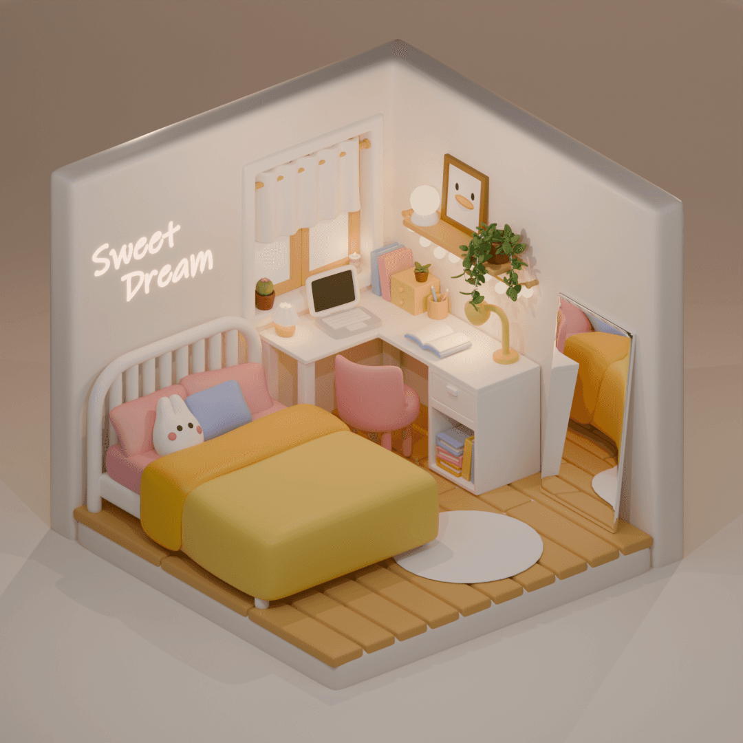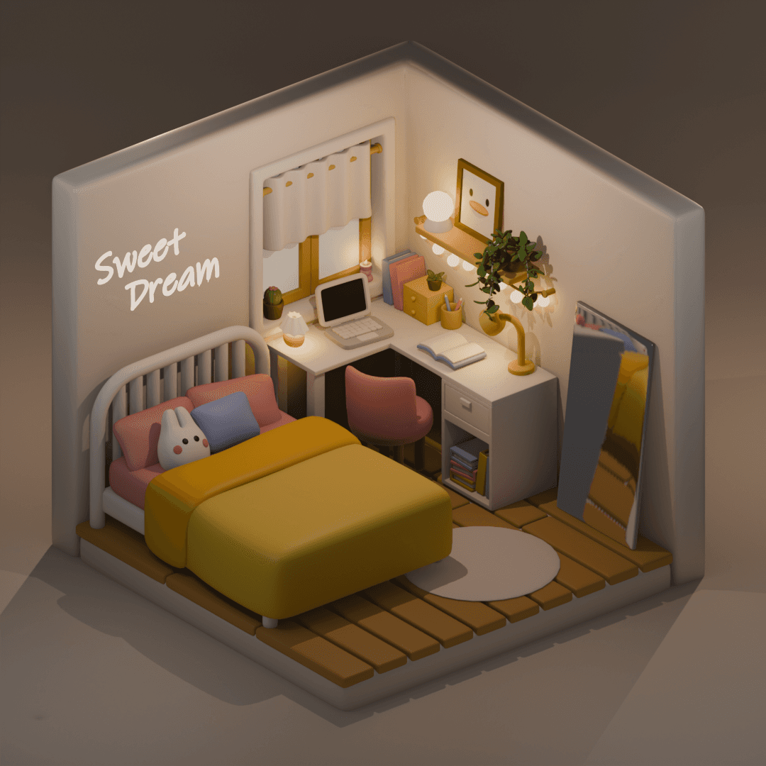 Étant une curieuse qui adore découvrir et apprendre de nouvelle chose, je me suis décidée à mettre un premier pas dans la 3D en modélisant cette chambre à l'ambiance cozy et chaleureuse.